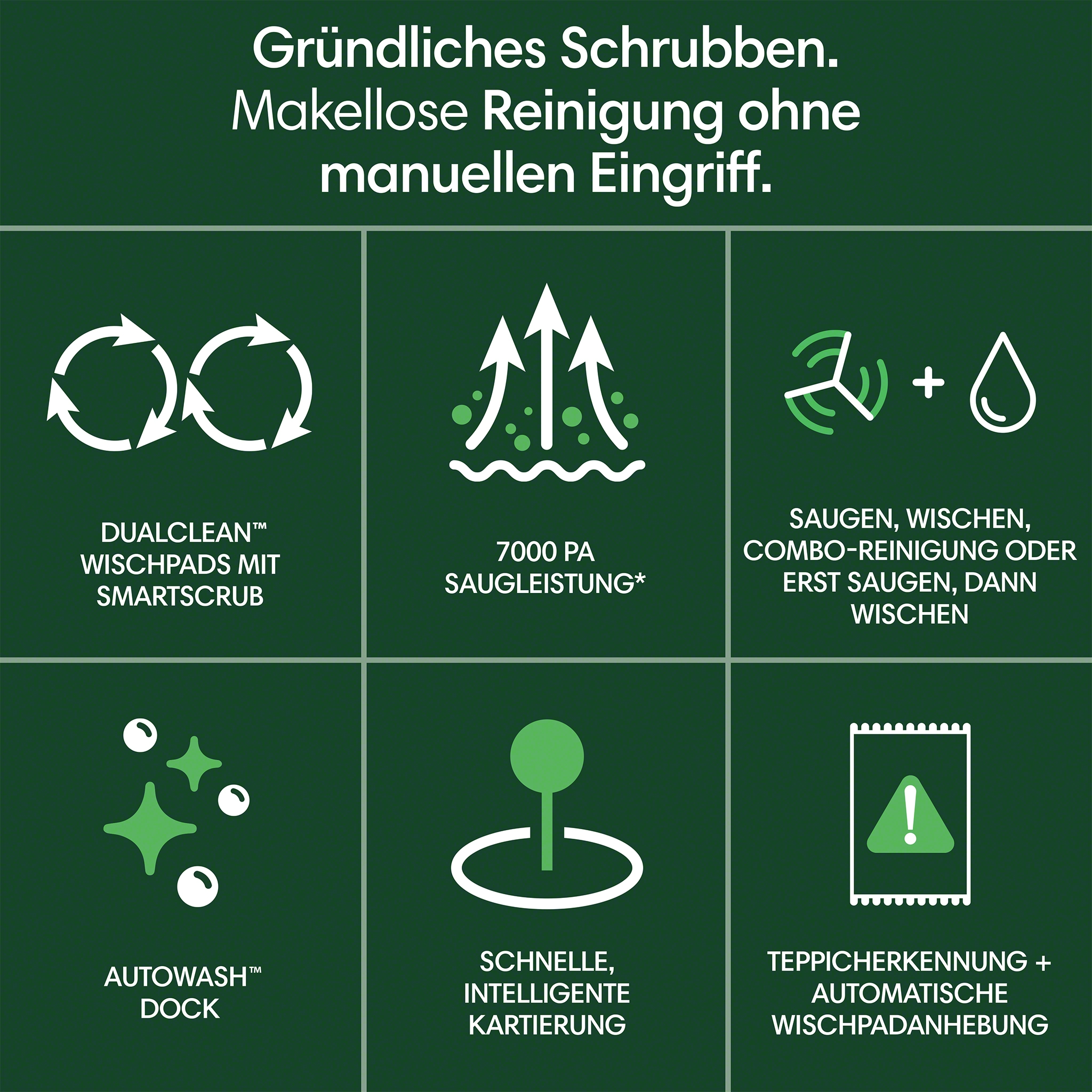 Robot vacuum and mopCHF 599.00DualClean™ Mop Pads with SmartScrub, 7000 Pa suction power, ClearView™ LiDAR vavigation, AutoWash™ Dock for automatic emptying, cleaning, and drying of the mopping pads Fast, smart mapping, Carpet Detection + Auto Pad Lifting, Vac, Mop, Combo Clean or Vac then Mop