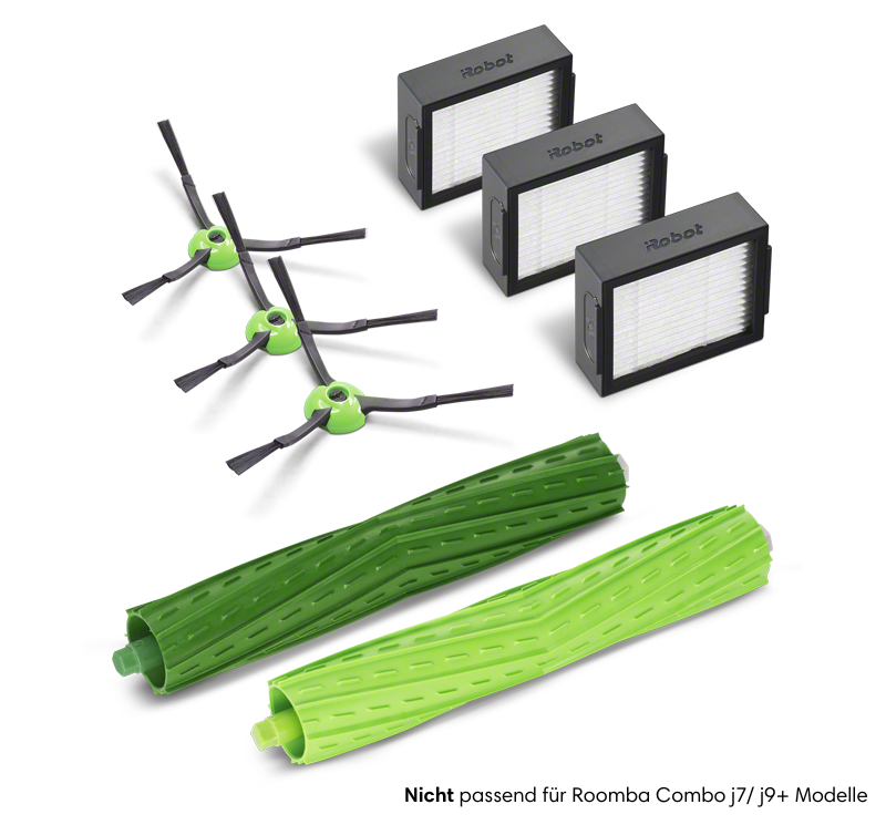 Alles, was du für die regelmässige Wartung deines Roomba® Staubsauger Roboters der Serie e, i und j sowie Combo™ i8 und j5 benötigst. Das Kit enthält drei Hochleistungsfilter, ein Set aus verfilzungsfreien Aufnahmerollen sowie drei Seitenbürsten.
